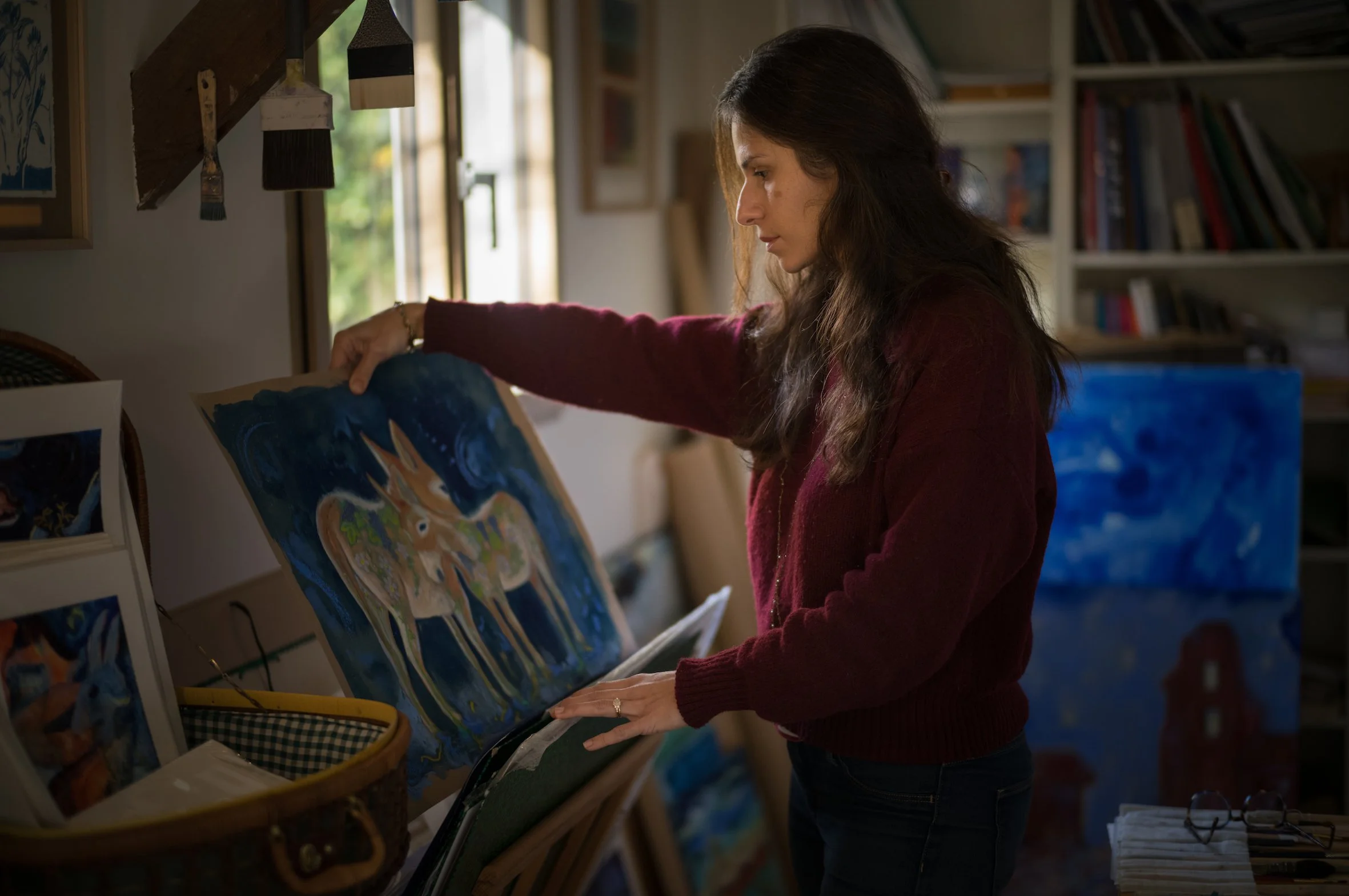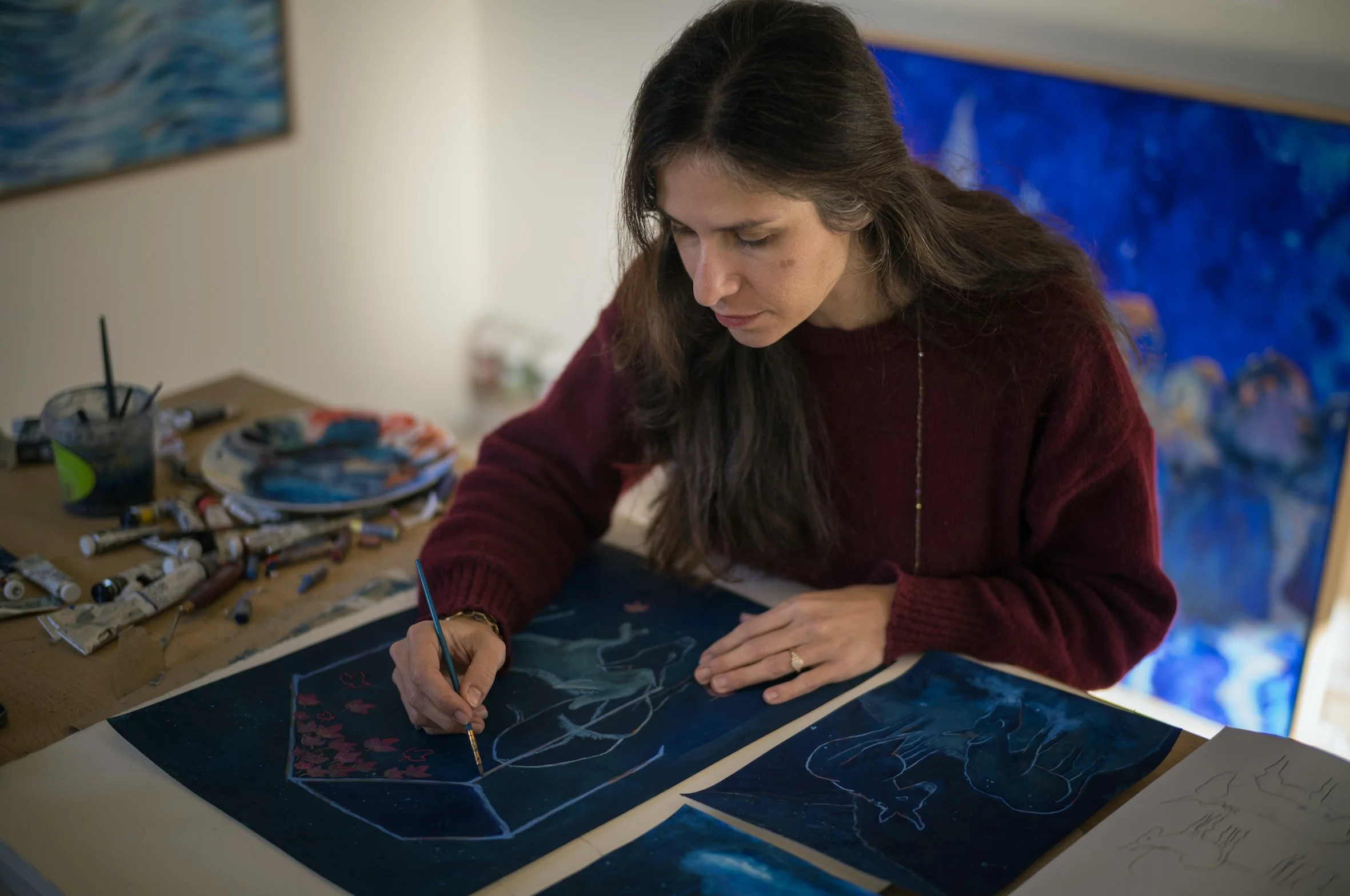 Jeanne-Sophie de Peretti vit et travaille dans les Yvelines. Autodidacte, son travail figuratif, mais toujours libre, cherche à capturer l’essence de ce qui se passe dans notre monde intérieur lorsque le monde extérieur s’évanouit. L’eau est également omniprésente dans son travail, comme représentation de l’inconscient du rêveur, de la mémoire, du pouvoir de création et autres symboliques. Elle retranscrit ces éléments en utilisant la gouache, le pastel gras, la broderie sur papier ou encore l’huile sur toile. Depuis 2023, Jeanne-Sophie de Peretti a participé à plusieurs expositions et résidences en France et a rejoint le projet du Cercle de l’Art. Elle collabore aussi avec des acteurs de la décoration haut de gamme et poursuit en parallèle ses travaux sur les liens entre l’artiste, l’eau, la vie intérieure et le vivant.